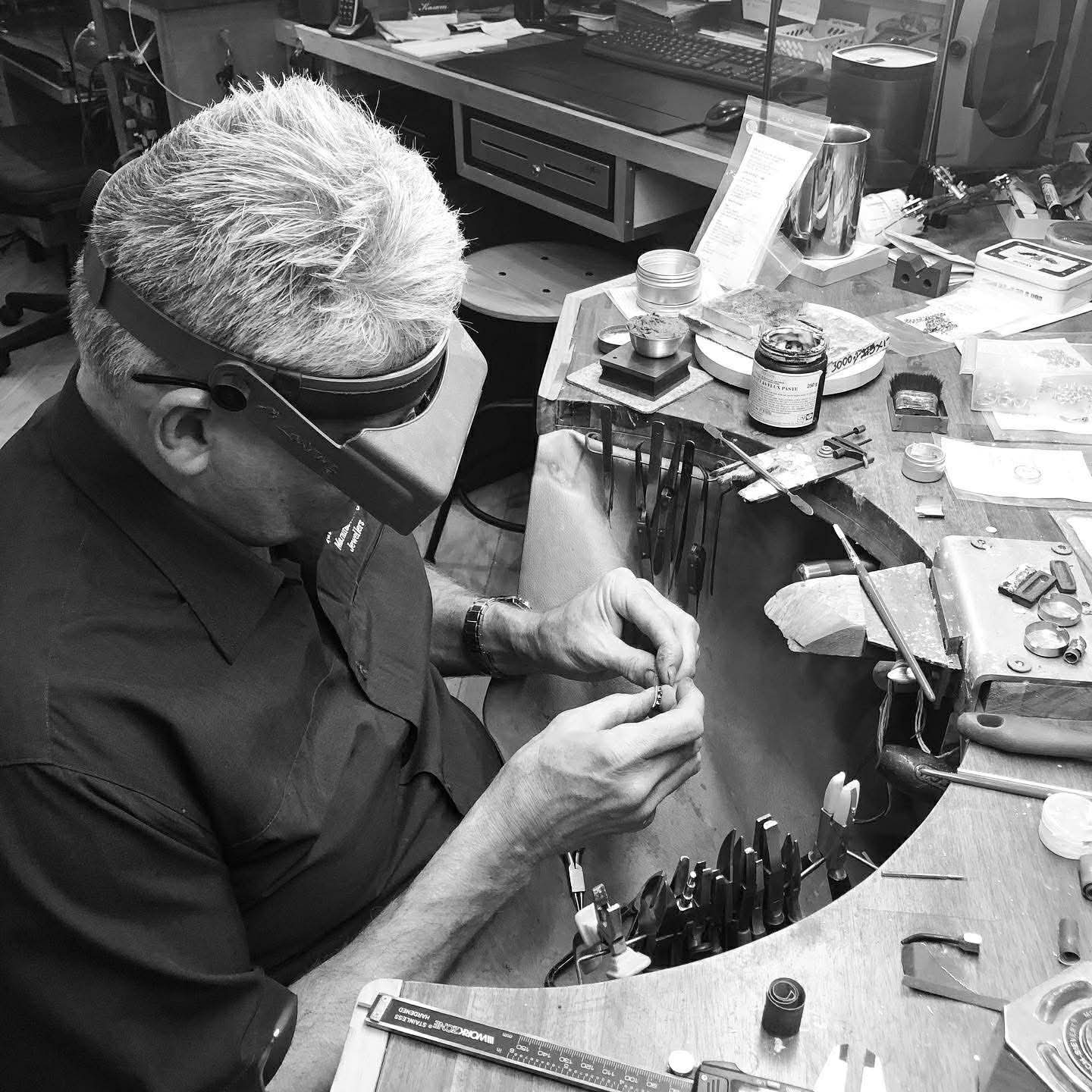 Your ring is then handcrafted by Maurice at the bench using traditional goldsmithing techniques and precise stone setting. Every element is carefully shaped, set and finished with meticulous attention to detail.