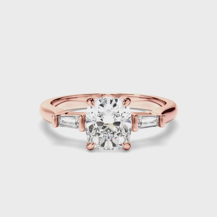 Celebrate your forever with the stunning Angelica Engagement Ring, a design that epitomises elegance and modernity. Featuring a brilliant cushion-cut centre stone, accented by two tapered baguette-cut side stones, this ring creates a sleek and refined silhouette that’s effortlessly timeless.