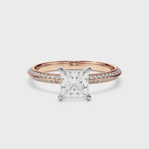 - Princess-cut centre stone, offering modern elegance with crisp, brilliant facets