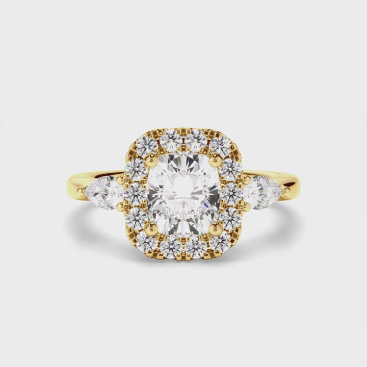- Cushion-cut centre stone with a diamond halo, radiating brilliance from every angle