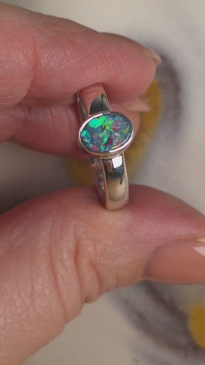 This handcrafted Coober Pedy Doublet Opal Ring is a vibrant celebration of Australian opal. Set in Palladium Silver, the design features a secure full bezel setting that frames the stone with clean, modern lines.