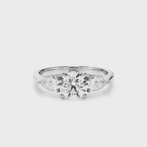The Dalia Engagement Ring is a custom-made masterpiece that perfectly blends classic elegance with modern refinement. At its centre, a dazzling round brilliant-cut diamond radiates exceptional brilliance, symbolising the strength of your love. This breathtaking centre stone is flanked by pear-cut diamonds, adding a graceful, tapered effect that enhances the ring’s overall harmony and balance. The timeless half-round band provides a sleek and comfortable fit, making this trilogy design a true celebration of past, present, and future.