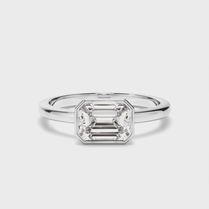 The Deni Engagement Ring is a striking design that combines timeless sophistication with contemporary style. Featuring a radiant emerald-cut centre stone, set horizontally in an elegant full bezel setting, this ring showcases a unique east-west orientation, highlighting the stone’s sleek, elongated facets. Paired with a classic half-round band, the Deni ring offers a perfect balance of minimalist design and modern refinement, ideal for those who appreciate understated glamour.