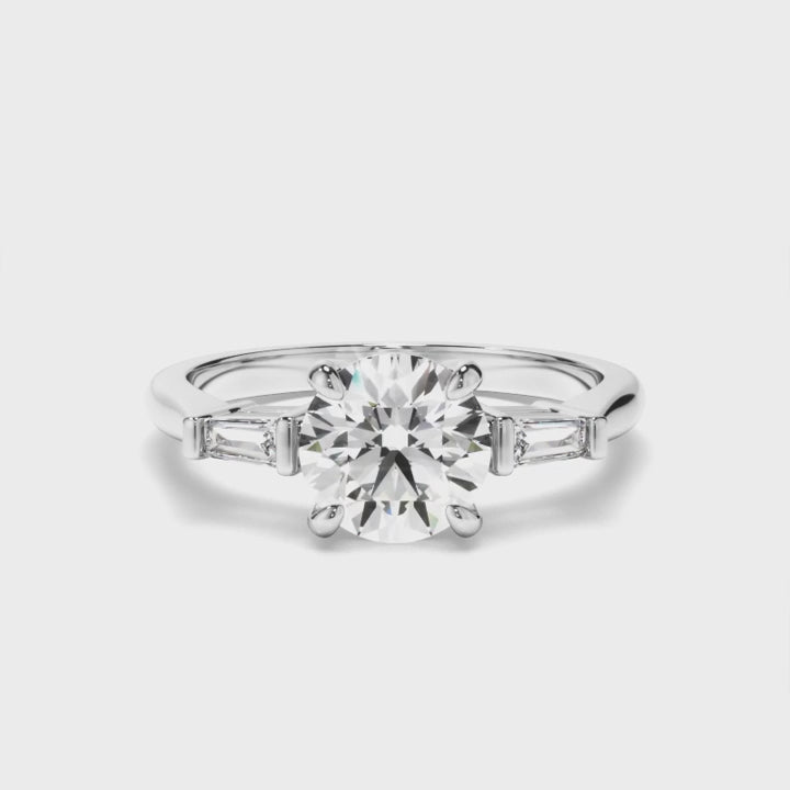 The Eva Engagement Ring is a custom-made masterpiece that blends timeless beauty with refined sophistication. At its heart, a dazzling round brilliant-cut diamond takes centre stage, symbolising the brilliance of your love. It is perfectly flanked by tapered baguette-cut diamonds, creating a striking contrast between classic sparkle and sleek, geometric lines. The elegant half-round band provides a seamless and comfortable fit, ensuring a design that is both timeless and effortlessly wearable.
