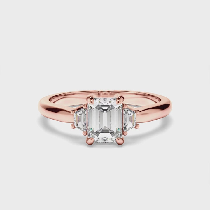 The Georgia Engagement Ring is a design that perfectly balances timeless sophistication with modern flair. Featuring a stunning emerald-cut centre stone, this ring highlights the stone’s sleek, elongated facets and captivating brilliance. Flanking the centrepiece are two striking trapezoid-cut shoulder stones, seamlessly blending into the design to create a bold yet graceful silhouette. Paired with a classic plain band, the Georgia ring is a beautiful celebration of refined elegance.