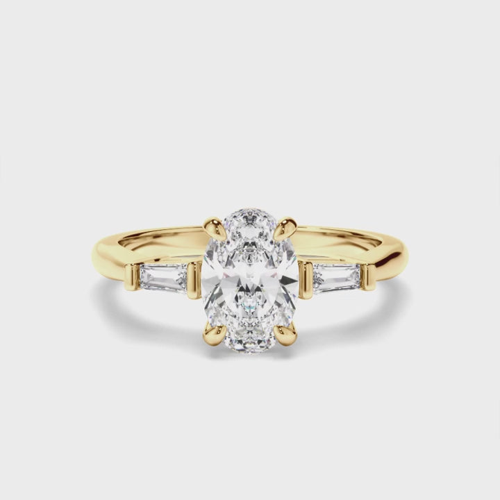 The Gilia Engagement Ring is a timeless design that beautifully combines grace and modern sophistication. At its centre is a stunning oval-cut stone, held securely in an elegant four-claw setting, showcasing its elongated brilliance and timeless charm. The centrepiece is perfectly complemented by tapered baguette-cut shoulder stones, adding a sleek, geometric touch to the design, resulting in a ring that exudes understated luxury and elegance.