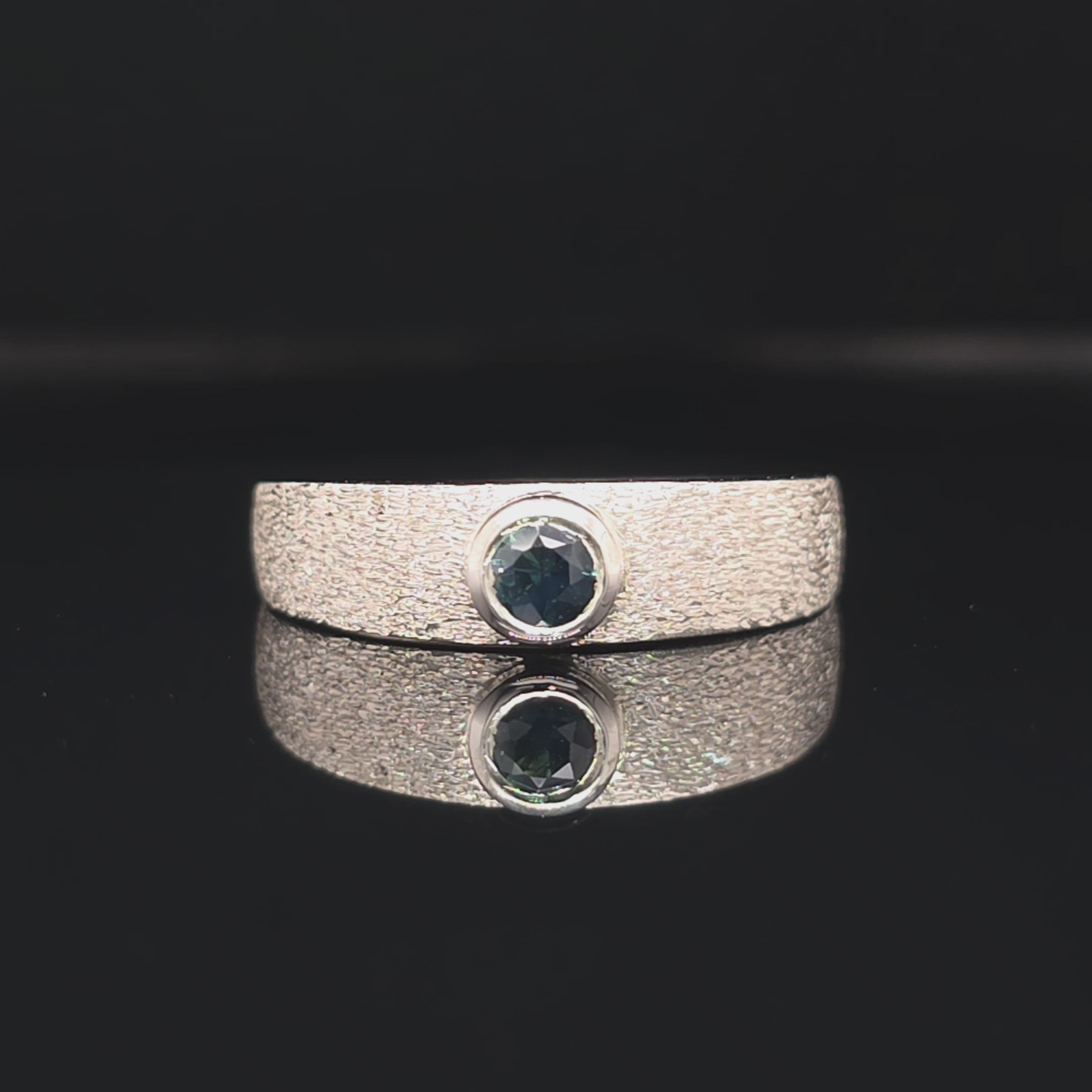 A true celebration of Australian beauty, this handcrafted palladium silver ring showcases a 0.32ct natural blue Australian sapphire in a sleek full bezel setting. The sapphire’s deep ocean hue contrasts beautifully against the cool tones of palladium silver, while the textured band adds a unique artisan finish.
