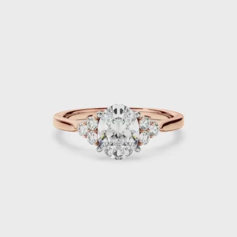 - Oval-cut centre stone, offering timeless elegance and graceful brilliance