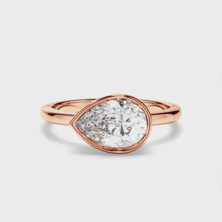 The Jacqueline Engagement Ring is a sleek and contemporary design that combines elegance with a bold, modern edge. Featuring a stunning pear-cut centre stone set in a refined full bezel setting, the stone is oriented in an east-west style, offering a unique twist on a timeless shape. Paired with a classic plain half-round band, the Jacqueline ring perfectly balances minimalist charm with a striking focal point, making it an exceptional choice for those who appreciate understated luxury.
