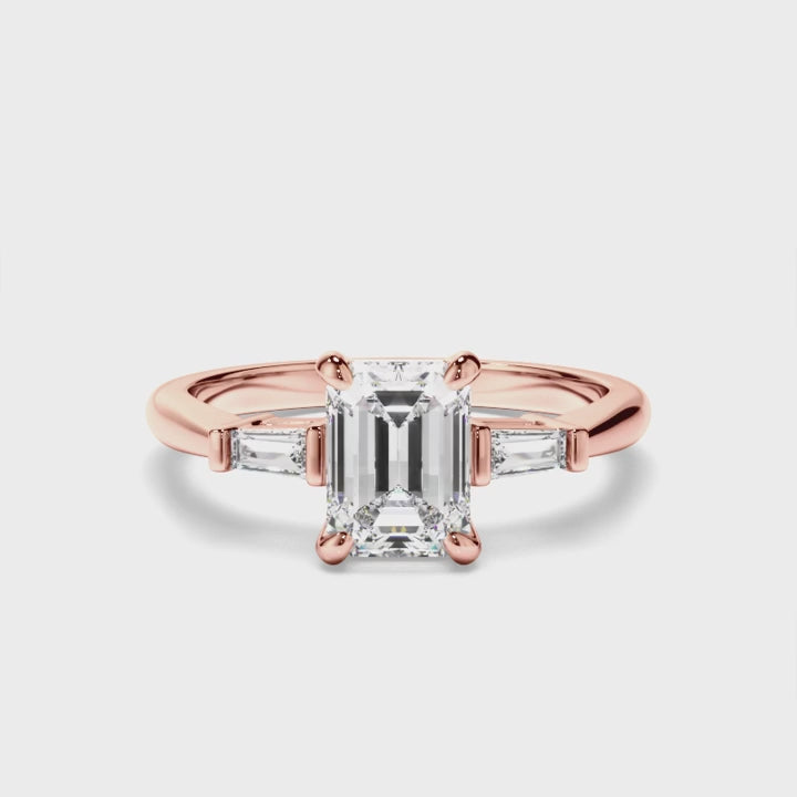 - Emerald-cut centre stone, offering sleek, elongated facets for a sophisticated and timeless look