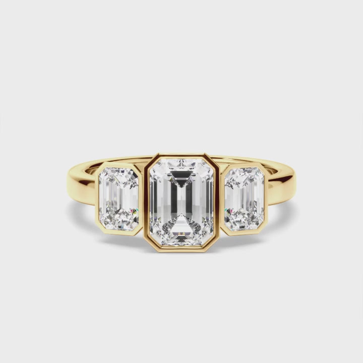 The Mabel Engagement Ring is a striking design that embodies refined beauty and contemporary charm. Featuring a radiant emerald-cut centre stone in a sleek full bezel setting, this trilogy ring offers both security and modern elegance. Flanked by two smaller emerald-cut stones, the Mabel ring symbolises your past, present, and future together, making it a meaningful and timeless choice for your love story.