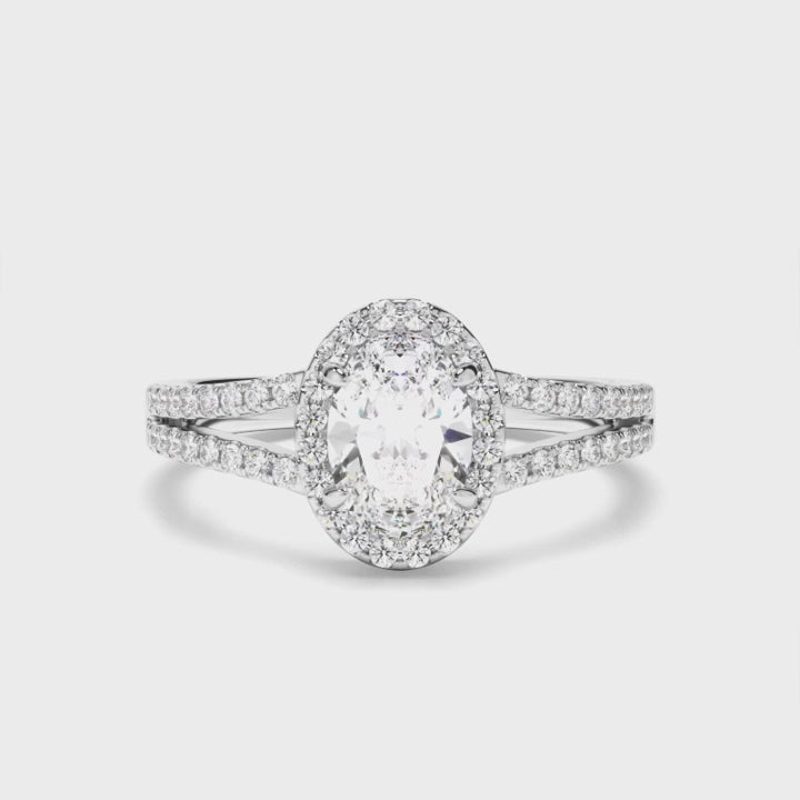 - Oval-cut centre stone with a diamond halo, creating a radiant and timeless focal point