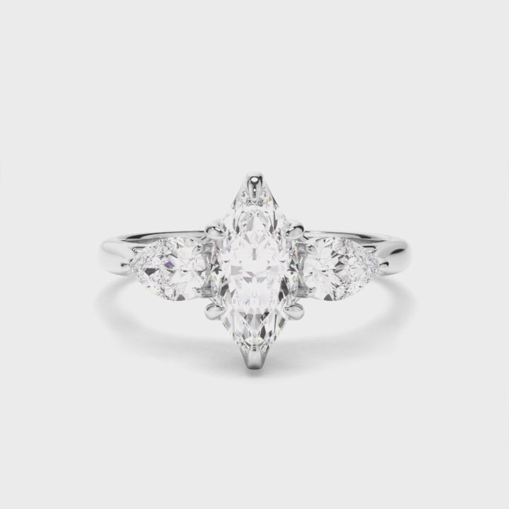 The Mahlia Engagement Ring is a timeless design that radiates elegance and charm. Featuring a stunning marquise-cut centre stone, secured in a classic 5-claw setting, this ring accentuates the brilliance and elongated silhouette of the stone. Enhanced by two dazzling pear-cut shoulder stones, the Mahlia ring creates a harmonious and graceful design, perfect for celebrating your unique love story.