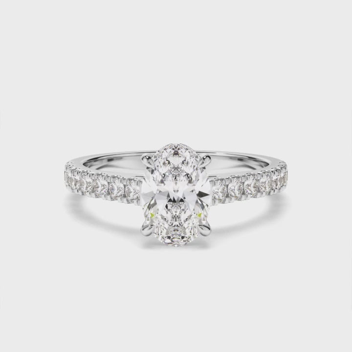 - Oval-cut centre stone, offering a timeless silhouette with exceptional brilliance