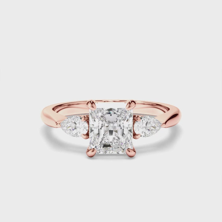 The Meline Engagement Ring is a beautifully balanced design, combining classic sophistication with modern brilliance. At its heart, a stunning radiant-cut centre stone takes centre stage, showcasing its crisp facets and exceptional fire. Flanking the centre stone are two elegant pear-cut shoulder stones, adding graceful symmetry and enhancing the ring’s brilliance. A sleek plain band completes the design, ensuring a timeless and refined aesthetic.