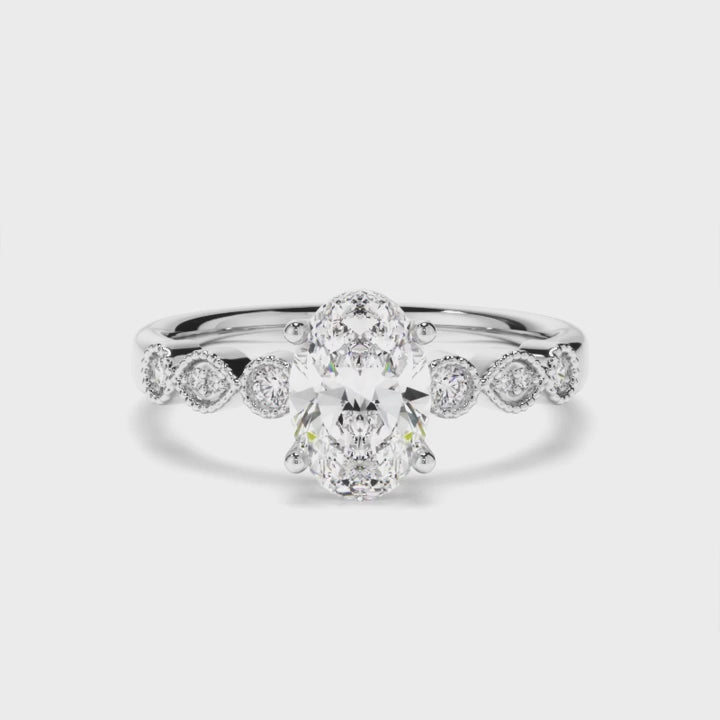 - Oval-cut centre stone, offering a graceful, elongated silhouette with exceptional brilliance