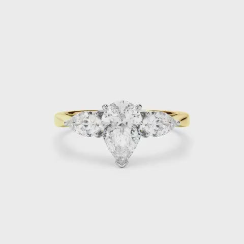 The Nicolette Engagement Ring is a captivating design that beautifully celebrates your love story. At its centre lies a dazzling pear-cut centre stone, celebrated for its graceful teardrop shape and radiant brilliance. This stunning focal point is perfectly flanked by two pear-cut shoulder stones, creating a harmonious trilogy design that symbolises your past, present, and future together.