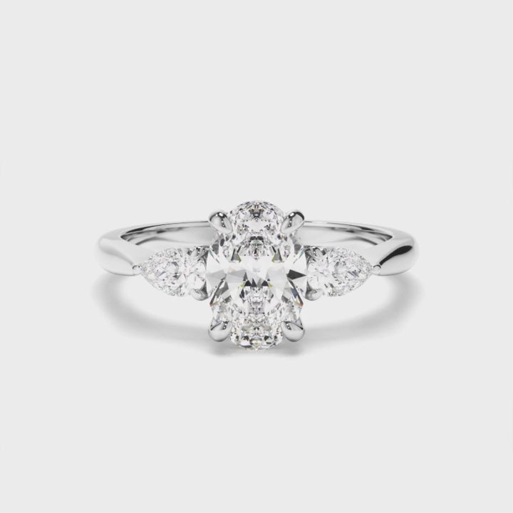 The Nicolosa Engagement Ring is a stunning embodiment of classic beauty and symbolic charm. Featuring a dazzling oval-cut centre stone, this ring highlights the stone’s elongated brilliance and graceful shape. Flanking the centrepiece are two exquisite pear-cut stones, perfectly complementing the design with their soft, tapered brilliance. The trilogy setting symbolises your past, present, and future together, making the Nicolosa ring a deeply meaningful and timeless choice for celebrating your love story.