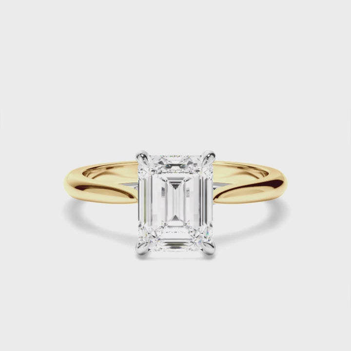 The Osana Engagement Ring is a design that seamlessly blends timeless sophistication with contemporary style. At its heart is a stunning emerald-cut centre stone, held securely in a classic four-claw setting that enhances its clean lines and brilliance. The reverse taper plain band adds a unique, modern touch to the design, perfectly balancing simplicity and striking elegance.