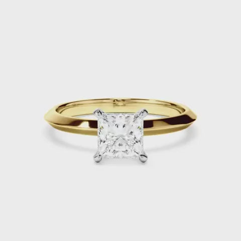 The Penelope Engagement Ring is a perfect blend of modern elegance and classic simplicity. Featuring a dazzling princess-cut centre stone, this solitaire design showcases the clean lines and brilliant facets of the square-cut diamond. Set on a refined knife-edge band, the design adds a contemporary touch, creating a ring that is both bold and timeless.