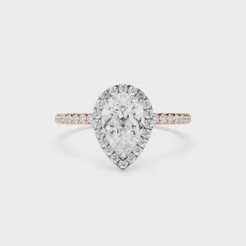 The Rachel Engagement Ring is a stunning masterpiece designed to captivate from every angle. Featuring a graceful pear-cut centre stone, framed by a shimmering halo of round brilliant diamonds, this ring accentuates the centre stone’s elongated teardrop shape with a touch of glamour. The brilliance continues along the diamond-set band, adorned with round brilliant-cut diamonds, ensuring the Rachel ring sparkles with breathtaking beauty.