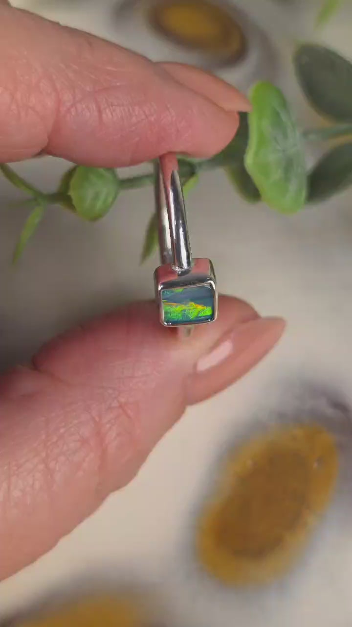 The rectangular cut gives the ring a confident, linear form, beautifully enhanced by the opal’s shimmering internal colour play—ideal for lovers of minimalist design with a unique gemstone twist.
