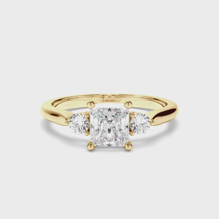 The Riley Engagement Ring is a perfect harmony of classic elegance and modern brilliance. At its heart, a stunning radiant-cut centre stone takes centre stage, showcasing its crisp facets and exceptional fire. Flanking the centre stone are round brilliant-cut shoulder stones, adding a touch of sparkle and balance while enhancing the ring’s overall brilliance.