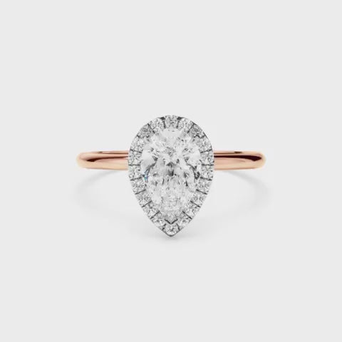 The Rose Engagement Ring is a beautifully refined design that perfectly blends grace and brilliance. Featuring a stunning pear-cut centre stone, surrounded by a shimmering halo of round brilliant diamonds, this ring enhances the natural beauty of the centre stone while adding a touch of glamour. The classic plain band keeps the design understated and elegant, allowing the centrepiece to shine as the focal point.