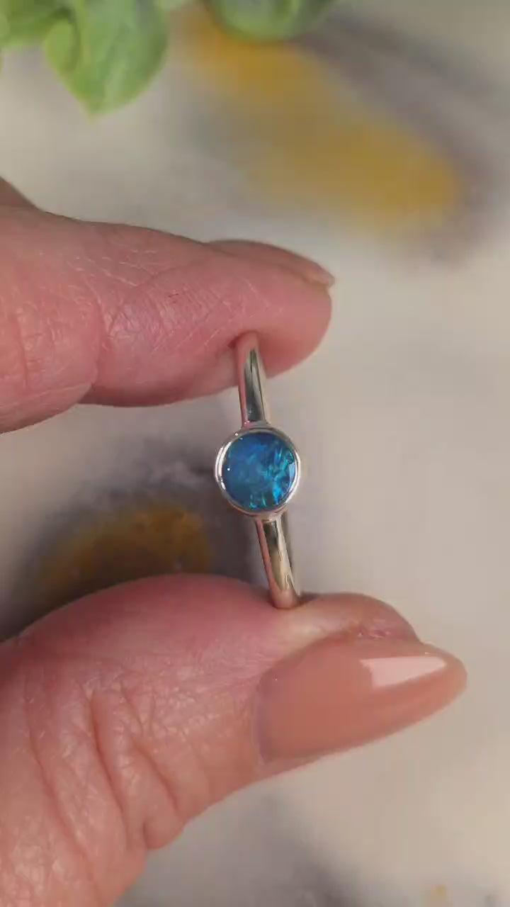 Refined and radiant, this Round Cut Coober Pedy Doublet Opal Ring showcases the best of Australian opal in a timeless silhouette. Expertly handcrafted in South Australia, the vibrant opal is securely set in a minimalist full bezel of Palladium Silver, offering both beauty and everyday wearability.