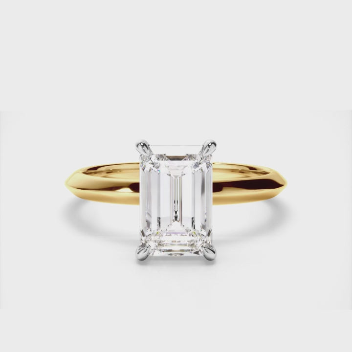 - Emerald-cut centre stone, offering sleek, elongated facets that exude sophistication