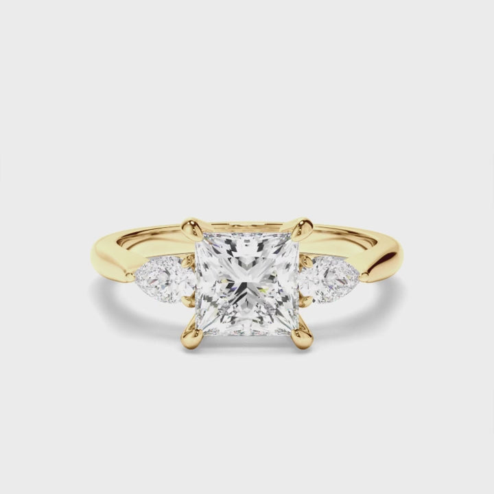 The Sabine Engagement Ring is a stunning fusion of classic beauty and modern sophistication. At its centre sits a striking princess-cut stone, known for its crisp angles and exceptional brilliance. This bold centrepiece is beautifully flanked by pear-cut shoulder stones, creating an elegant contrast between geometric precision and soft, flowing curves. A sleek plain band completes the design, allowing the exquisite stones to take centre stage.