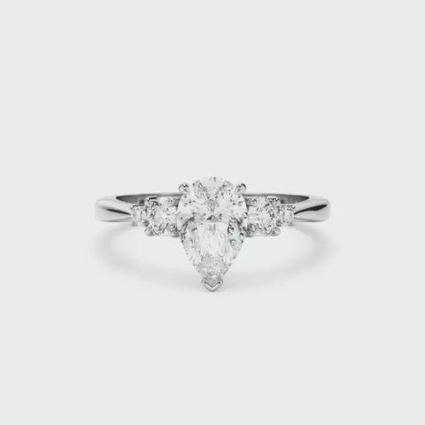 - Pear-cut centre stone, offering timeless elegance with its elongated, graceful brilliance