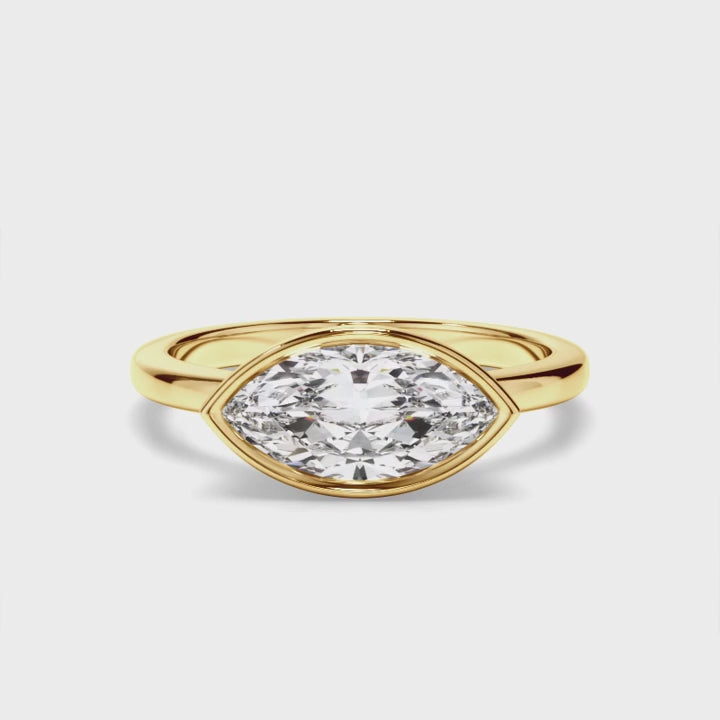 The Simone Engagement Ring is a stunning design that combines contemporary style with timeless elegance. Featuring a brilliant marquise-cut centre stone set in a sleek east-west orientation, this ring offers a bold and modern aesthetic. The full bezel setting securely encases the stone, enhancing its elongated brilliance while providing a clean, minimalist look. Paired with a classic half-round band, the Simone ring is a perfect choice for those seeking effortless elegance with a unique edge.