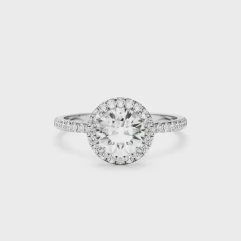 The Sylvia Engagement Ring is a custom-made masterpiece that blends classic elegance with dazzling radiance. At its heart, a breathtaking round brilliant-cut diamond is surrounded by a luminous halo of round brilliant-cut diamonds, enhancing its fire and brilliance. The sparkle continues along the diamond-set band, creating a seamless, radiant display from every angle.