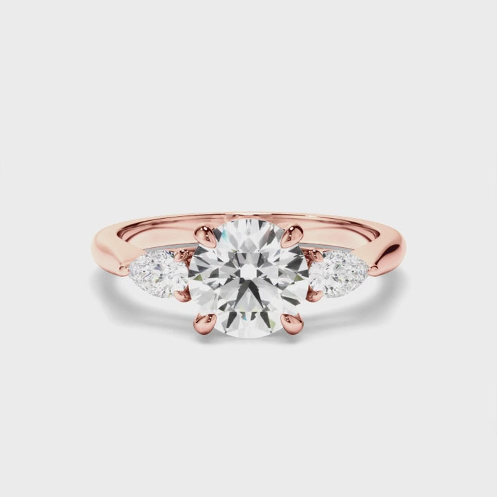 The Tatiana Engagement Ring is a custom-made masterpiece, designed to symbolise your past, present, and future with its stunning three-stone trilogy design. At its heart, a radiant round brilliant-cut diamond is flanked by two dazzling round brilliant-cut side stones, creating a perfect harmony of brilliance and meaning. The elegant half-round band provides a refined, comfortable fit, ensuring a timeless and sophisticated look.