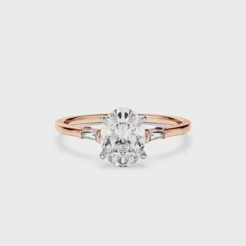 The Tommasia Engagement Ring is a refined design that beautifully blends timeless charm with contemporary style. Featuring a radiant oval-cut centre stone, secured in a sleek bar setting, this ring highlights the graceful curves and brilliance of the centrepiece. Flanking the oval-cut stone are elegant tapered baguette shoulder stones, adding a clean, geometric touch to the design. Perfectly balanced and understated, the Tommasia ring is a symbol of modern love with enduring elegance.
