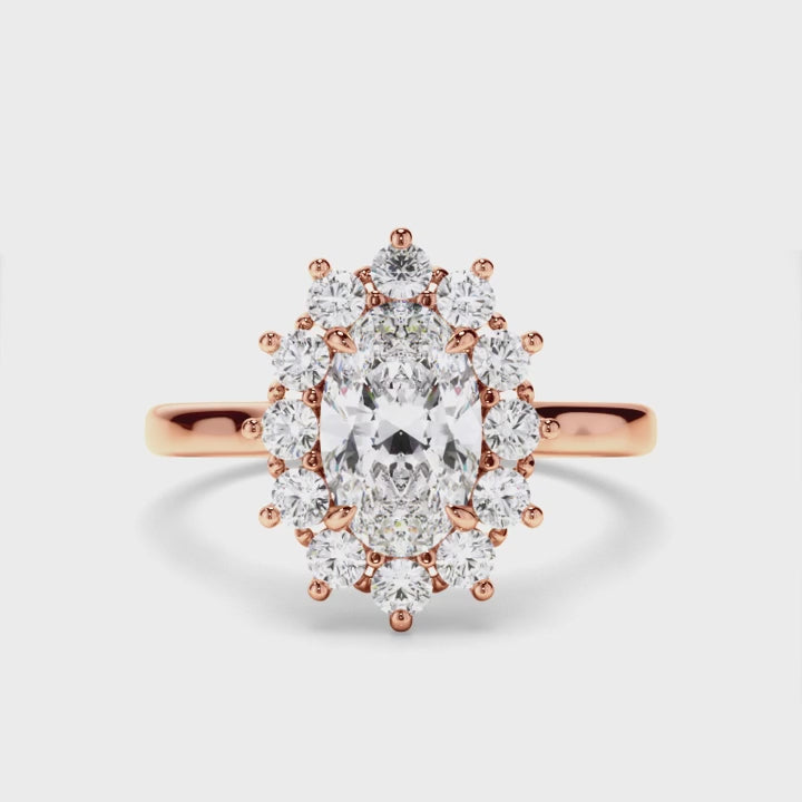- Oval-cut centre stone with a diamond halo, offering a romantic and timeless look with maximum sparkle